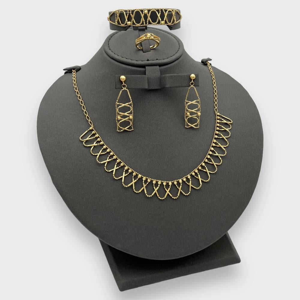متجر مجوهرات الصعب يقدم طقماً ذهبياً ناعماً يتميز بالأناقة والبساطة، مما يجعله مثالياً للإطلالات اليومية أو المناسبات الخاصة.